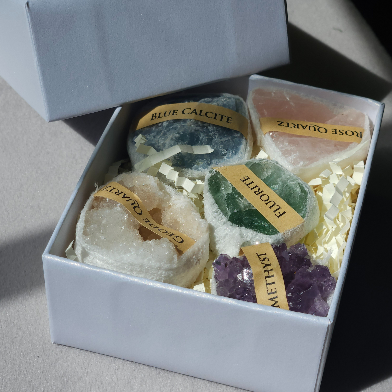 Discover the natural beauty of earth's treasures with our Minerals Gift Box. It is ideal for anyone looking to start or expand a stone collection, learn more about geology, or simply appreciate the aesthetic beauty of natural minerals. Each stone offers a glimpse into the Earth's diverse geological formations, making this set perfect for educational purposes, display, or as a thoughtful gift for nature lovers and collectors.This collection features a curated selection of rose quartz, blue calcite, amethyst, rock crystal geode, and fluorite. Each stone comes in its raw, unpolished form, showcasing its authentic, natural beauty.