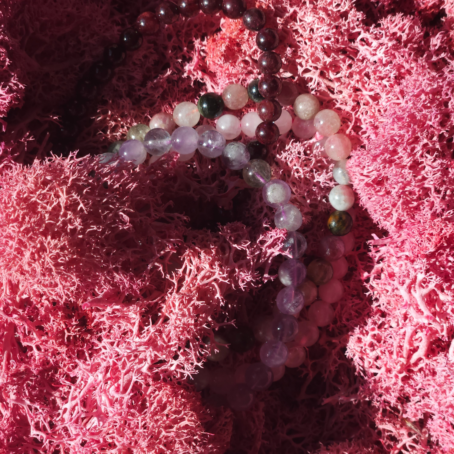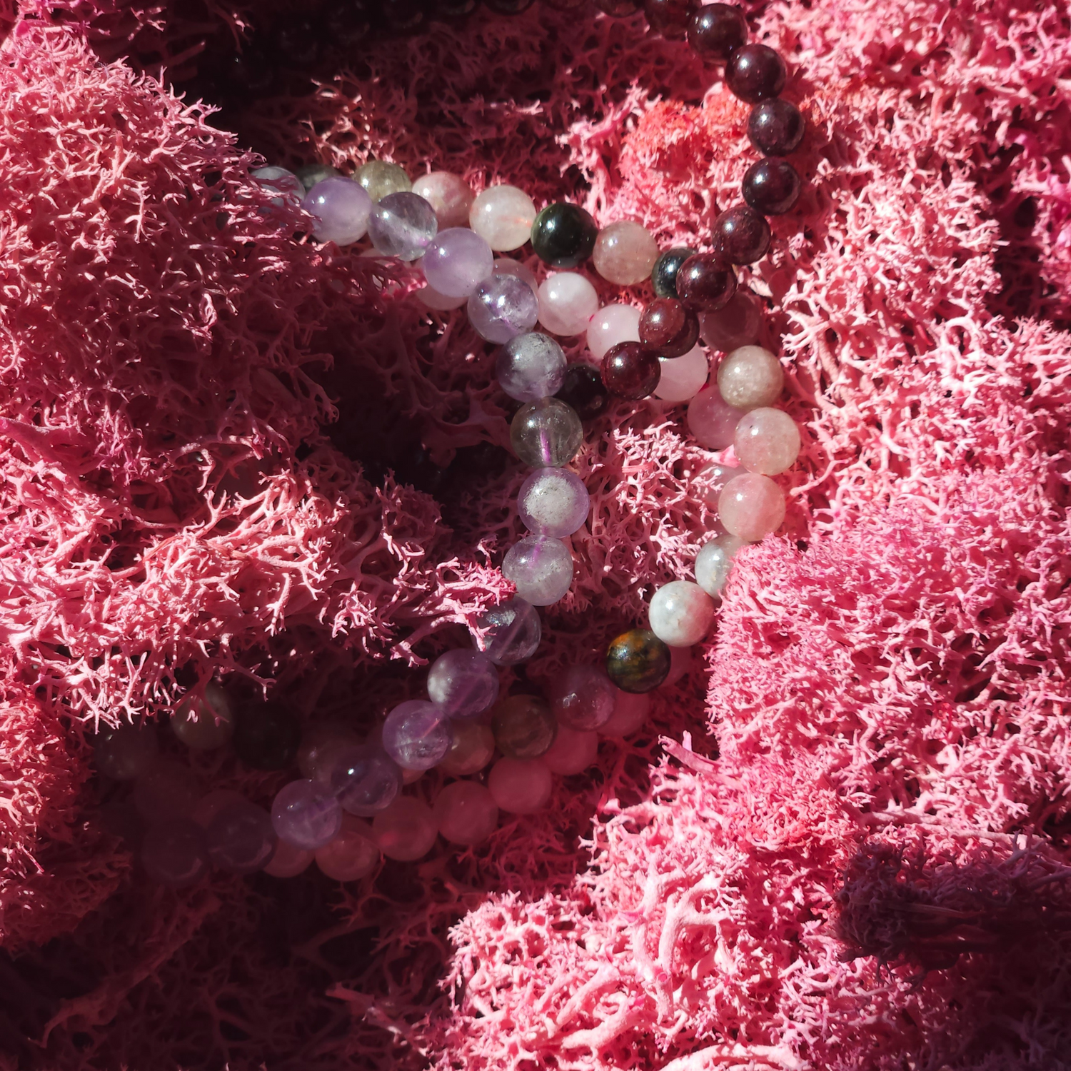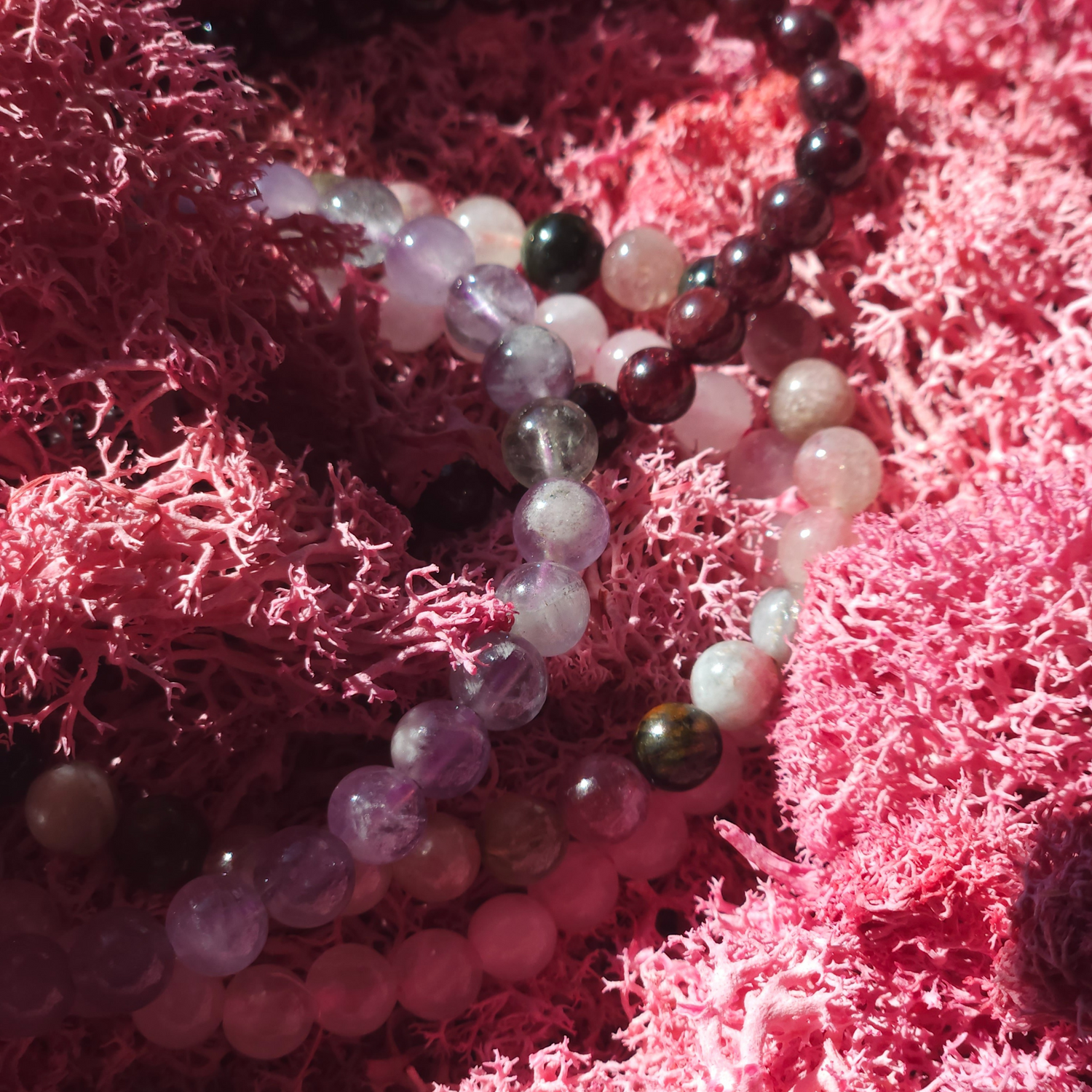 Step into a sanctuary of serenity with this thoughtfully crafted set, designed to help you release worry and embrace tranquility. The rich hues of Amethyst, Rose Quartz, Tourmaline Multicolor, and Garnet work harmoniously to create a calming energy that supports emotional clarity and grounded calmness.